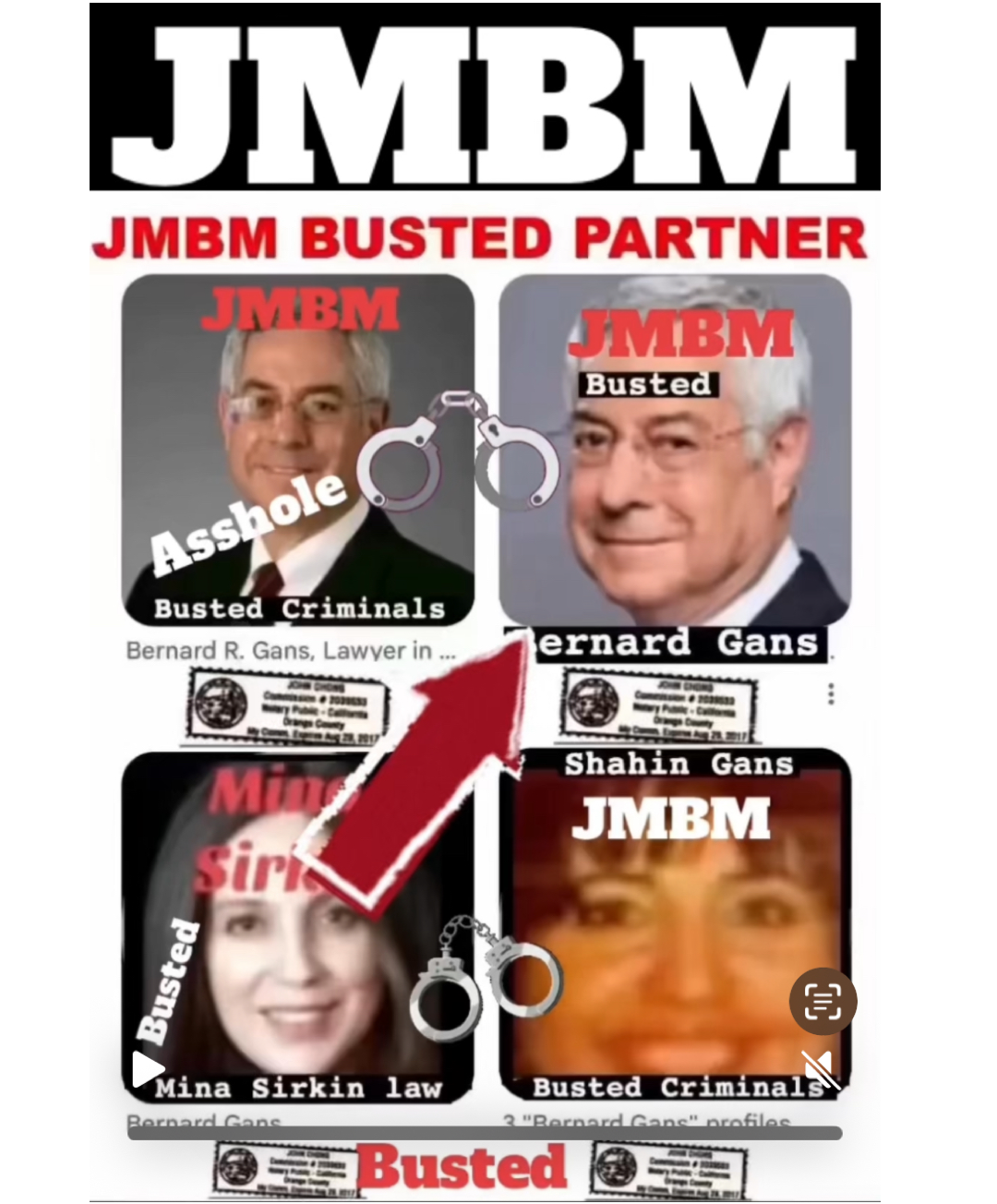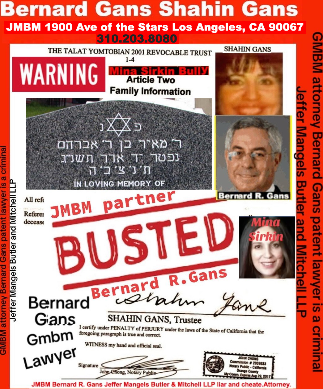 76 year old Century city JMBM busted attorney Bernard Reginald Gans known as Bernie graduate of Santa Barbara university married to Shahin Gans 50 years of success to satisfy his wife he made one stupid mistake and it all crashed down. Well done Bernie well done.Bernard R Gans Articles Jeffer Mangels Butler & Mitchel LLP 76 year old Century city JMBM busted attorney Bernard Reginald Gans known as Bernie graduate of Santa Barbara university married to Shahin Gans 50 years of success to satisfy his wife he made one stupid mistake and it all crashed down. Well done Bernie well done.Bernard R Gans Articles Jeffer Mangels Butler & Mitchel LLP